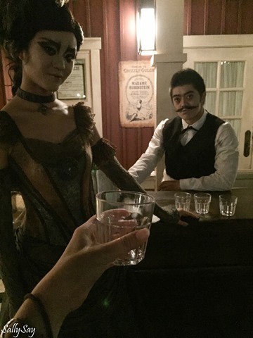 遠方的酒保向我們招手,倒了一杯酒,乾杯!